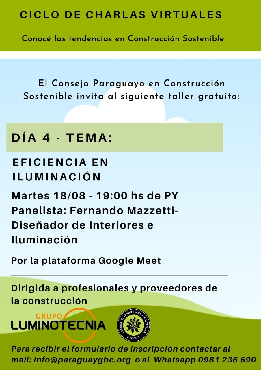 Participación en el Ciclo de charlas virtuales del Consejo Paraguayo en Construcción sostenible Categories: Cursos, seminarios y charlasBy María Fernanda1 agosto, 2020 Author: María Fernanda Post navigationPreviousPrevious post:Webinario para Estévez (México)NextNext post:Algunas conferencias que dicté en estos díasRelated PostsConferencia «La luz como herramienta de diseño en ámbitos de Salud»25 septiembre, 2023Buildgreen Paraguay 20225 noviembre, 2022Capacitación en la empresa «Luminotecnia» de Asunción, Paraguay.17 octubre, 2022Charla «Interiores habitacionales e iluminación centrada en el ser humano»21 julio, 2022Instagram live con Laura Arroyo Rocha15 julio, 2022Charla Diseño de Iluminación en Retail. & Estrategias de diseño comercial, post pandemia.1 julio, 2022