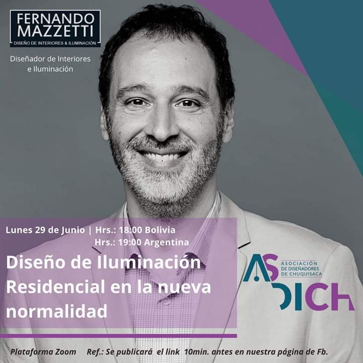 Conferencia online de Fernando Mazzetti sobre «Diseño de Iluminación Residencial en la nueva normalidad». Organizado por Asdich, Asociación de Diseñadores de Interiores de Chuquisaca, Sucre, Bolivia